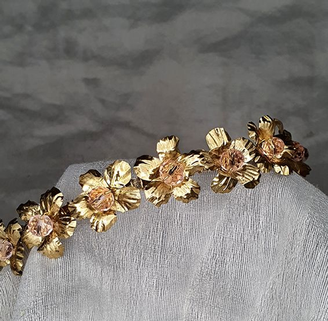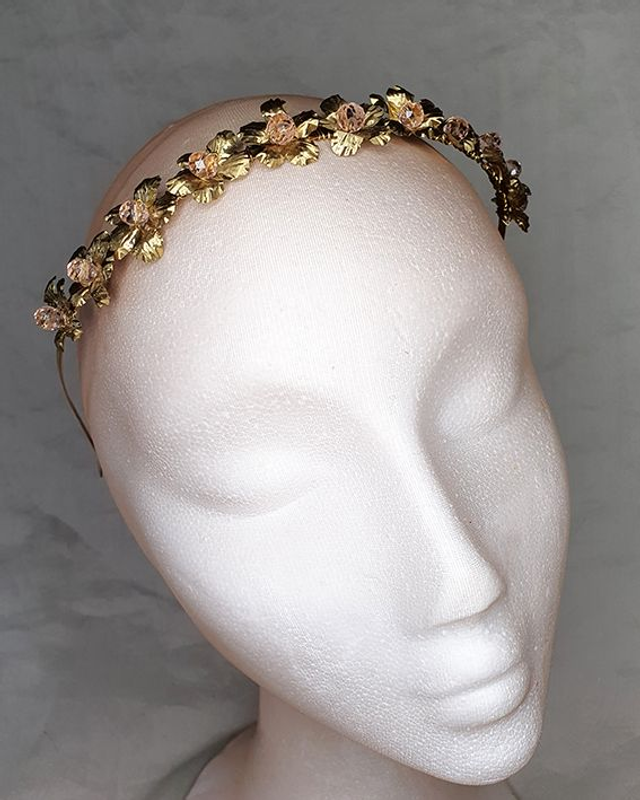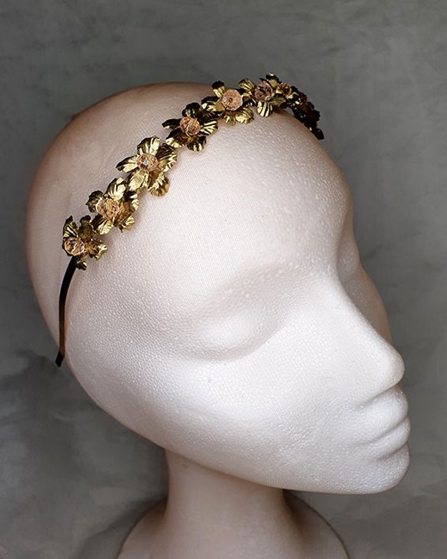 La pieza es ligera, cómoda de llevar y se asienta sobre una diadema en el mismo tono dorado. Ideal para invitadas, ceremonias, cenas especiales y looks festivos minimalistas con acento dorado.