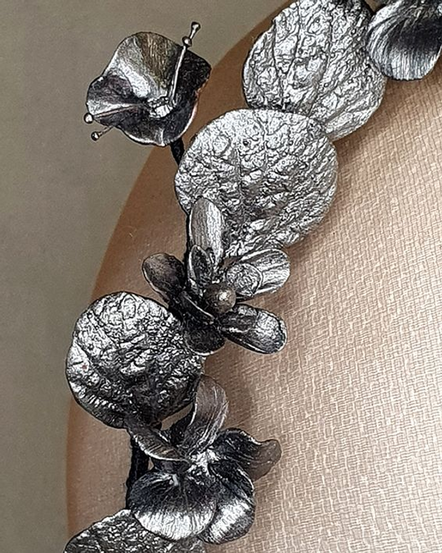 Diadema-tiara artesanal con flores y hojas modeladas una a una en porcelana fría y acabado plateado envejecido. Un diseño ligero, femenino y contemporáneo que aporta brillo sin exceso, con un aire casi de “metal esmaltado” vintage. Perfecta para elevar un estilismo minimal, para invitada sofisticada o una novia moderna que busca un detalle único, no tradicional, pero lleno de presencia.