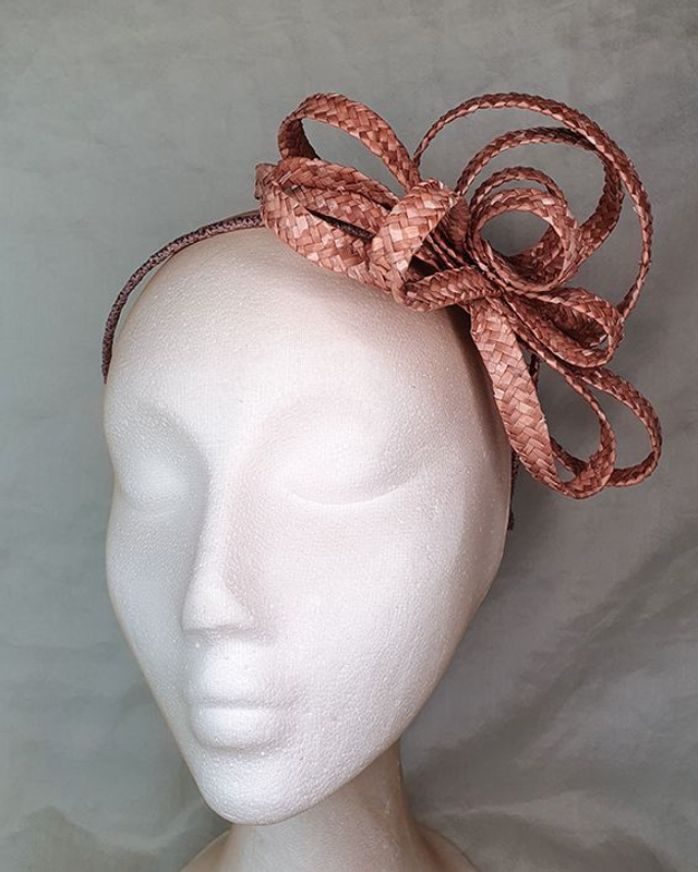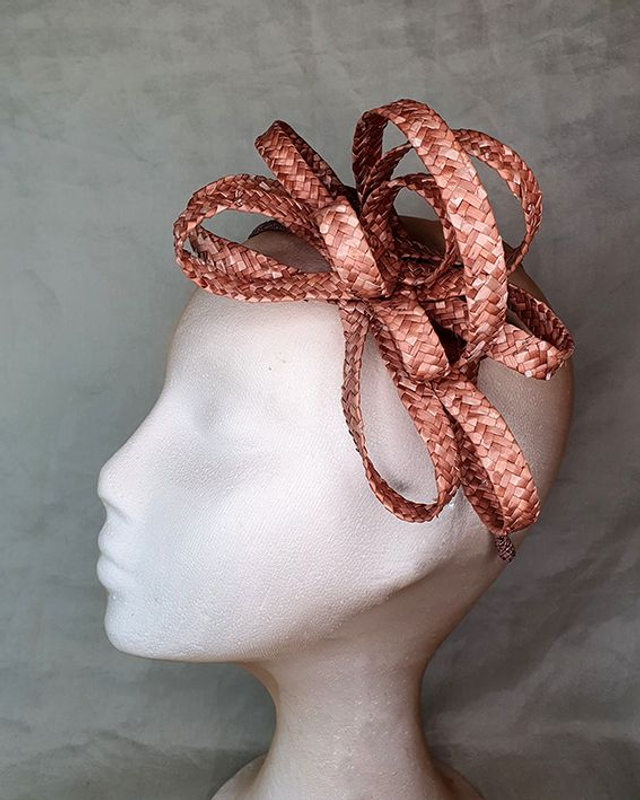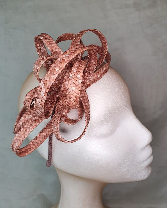 Tocado tipo fascinator elaborado con trenza de paja moldeada a mano en un delicado tono rosa viejo. Sus volúmenes ligeros y escultóricos aportan altura sin peso visual, creando un efecto elegante, moderno y muy femenino. Pieza ligera, cómoda y fácil de llevar gracias a la diadema integrada.