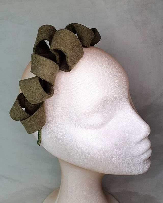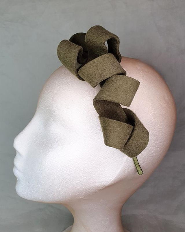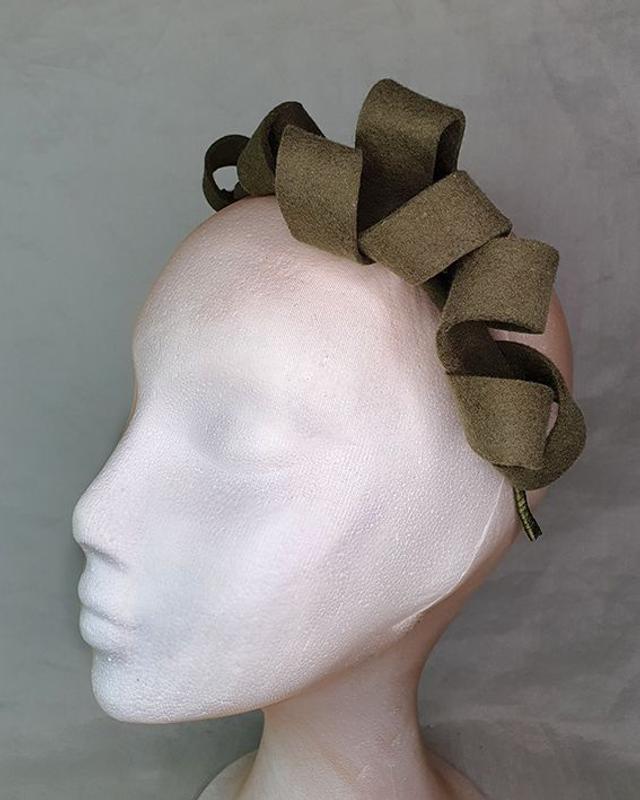 Tocado escultural elaborado con tiras de fieltro de lana —restos y cortes recuperados del proceso de confección de alas de sombrero— se transforman aquí en volúmenes ligeros y dinámicos. Cada curva se moldea y se cose a mano, creando una pieza única, contemporánea y con presencia.