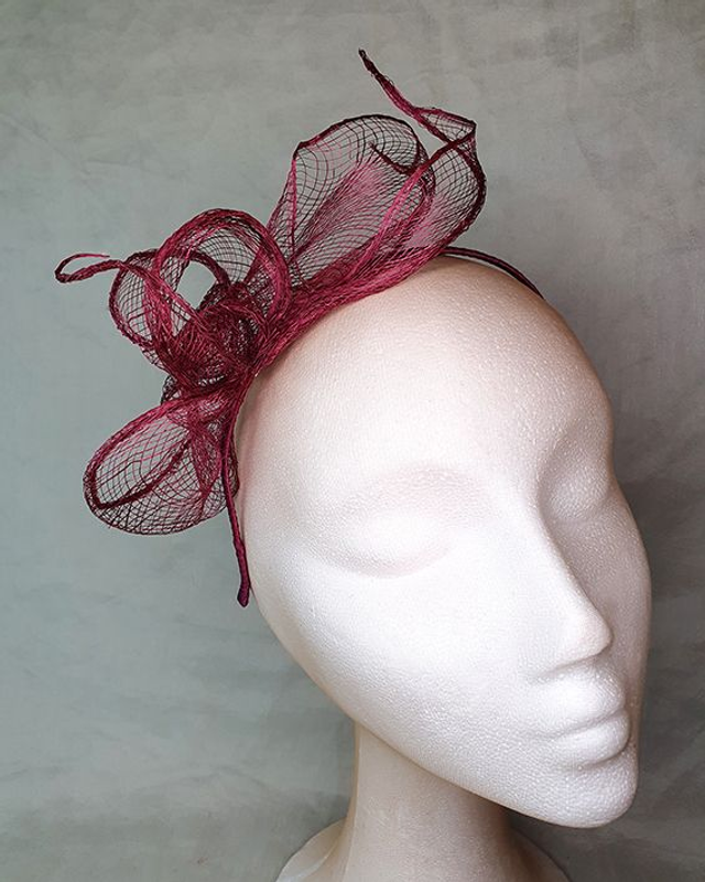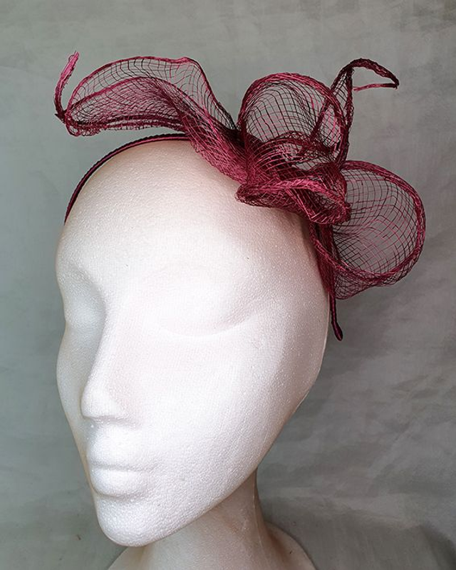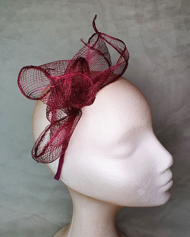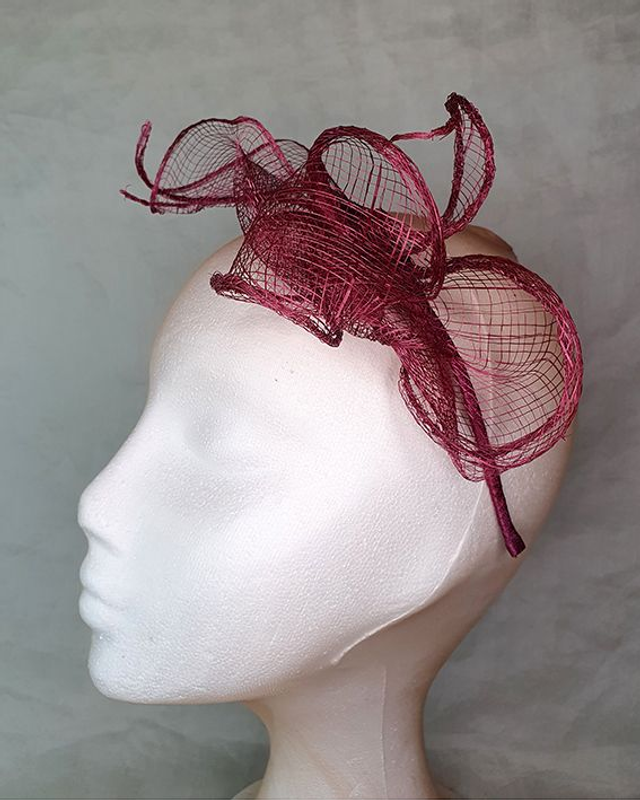 Tocado ligero y delicado elaborado en sinamay granate, moldeado a mano con volúmenes orgánicos que parecen flotar sobre la diadema. Su diseño vaporoso aporta movimiento y elegancia sin recargar el look, creando un efecto etéreo y femenino perfecto para invitadas que buscan algo especial y diferente.