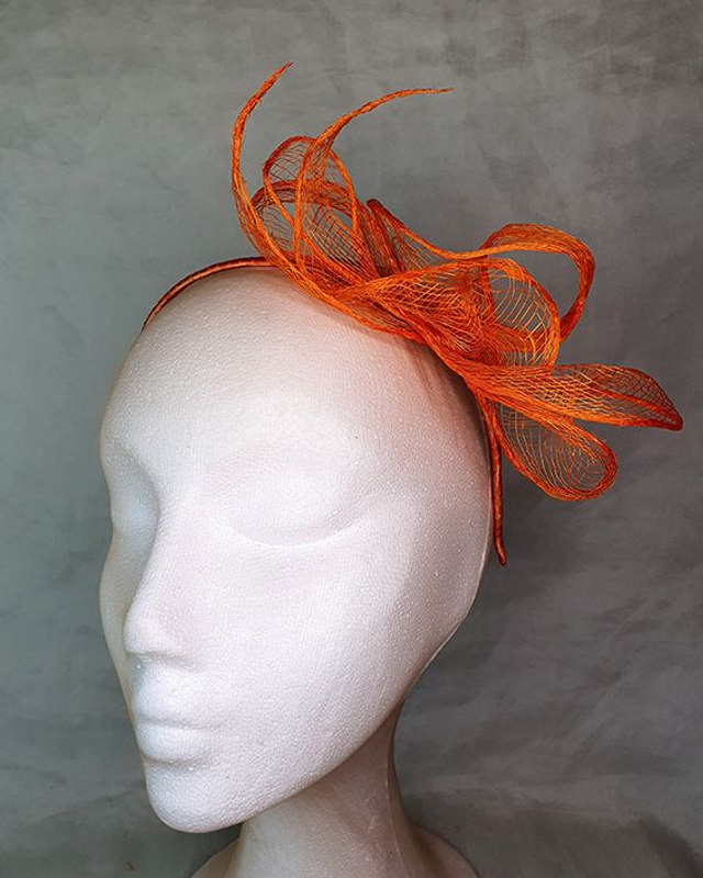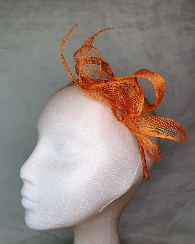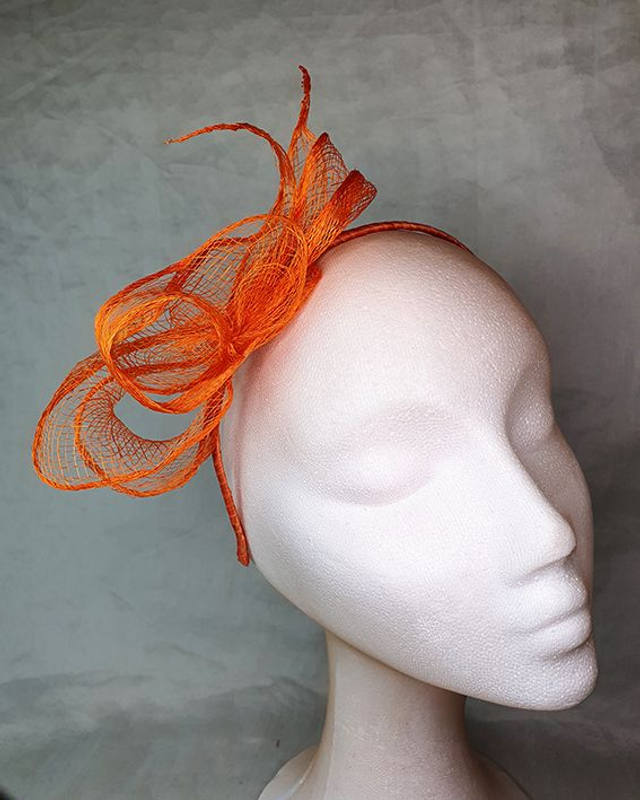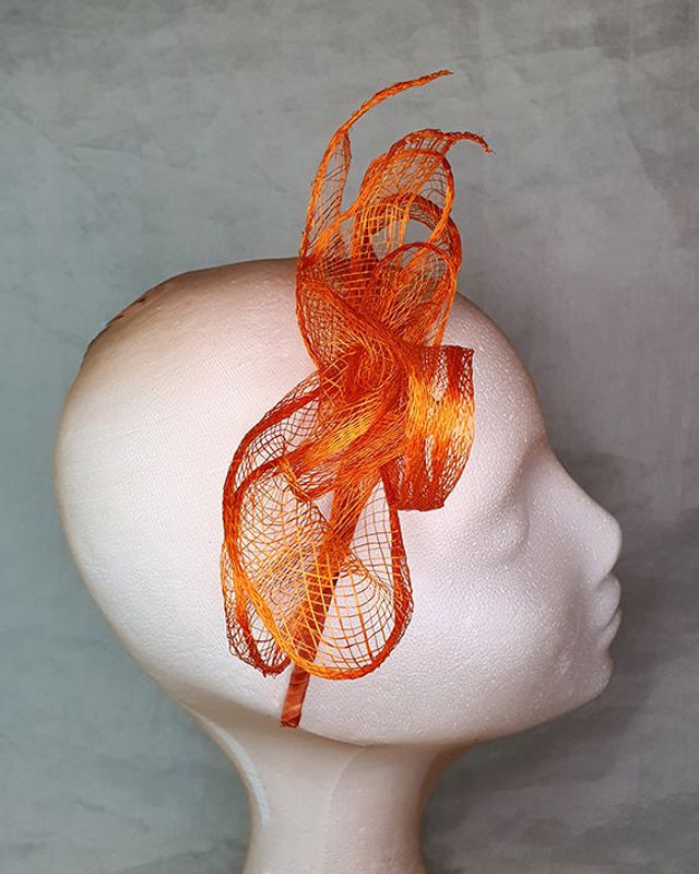 Tocado ligero y delicado elaborado en sinamay naranja, moldeado a mano con volúmenes orgánicos que parecen flotar sobre la diadema. Su diseño vaporoso aporta movimiento y elegancia sin recargar el look, creando un efecto etéreo y femenino perfecto para invitadas que buscan algo especial y diferente.