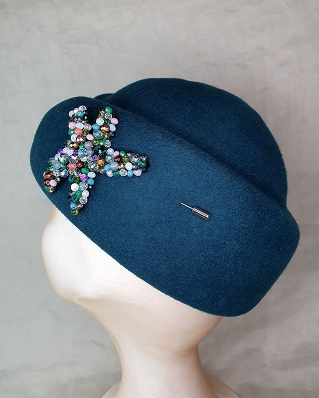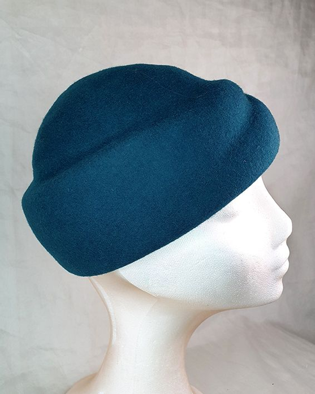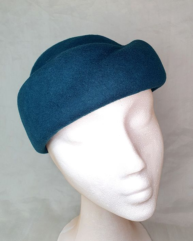 Una obra de estilo vintage reinventado: este casquete está confeccionado en fieltro de lana en un profundo tono azul petróleo, modelado con horma vintage de diseño completamente actual y elegante. Interior está forrado en algodón 100 %