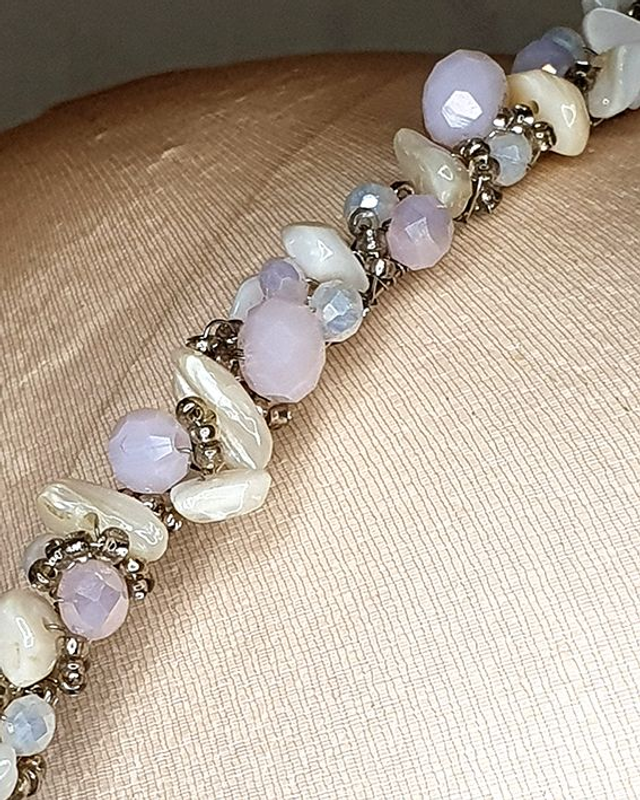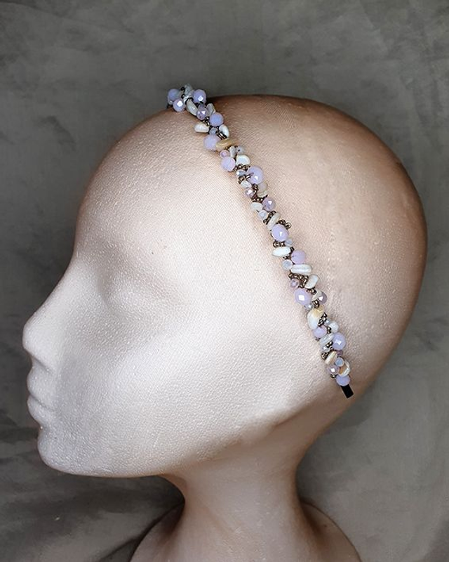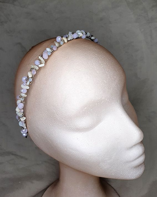 Diadema fina y elegante, hecha a mano con pequeñas piezas de nácar natural en tonos blanco perlado, combinadas con cristales que aportan destellos delicados y sutiles en tonos rosado, blanco y plata. Una pieza muy ligera y cómoda, perfecta para invitadas que buscan un accesorio minimalista con un toque joya.